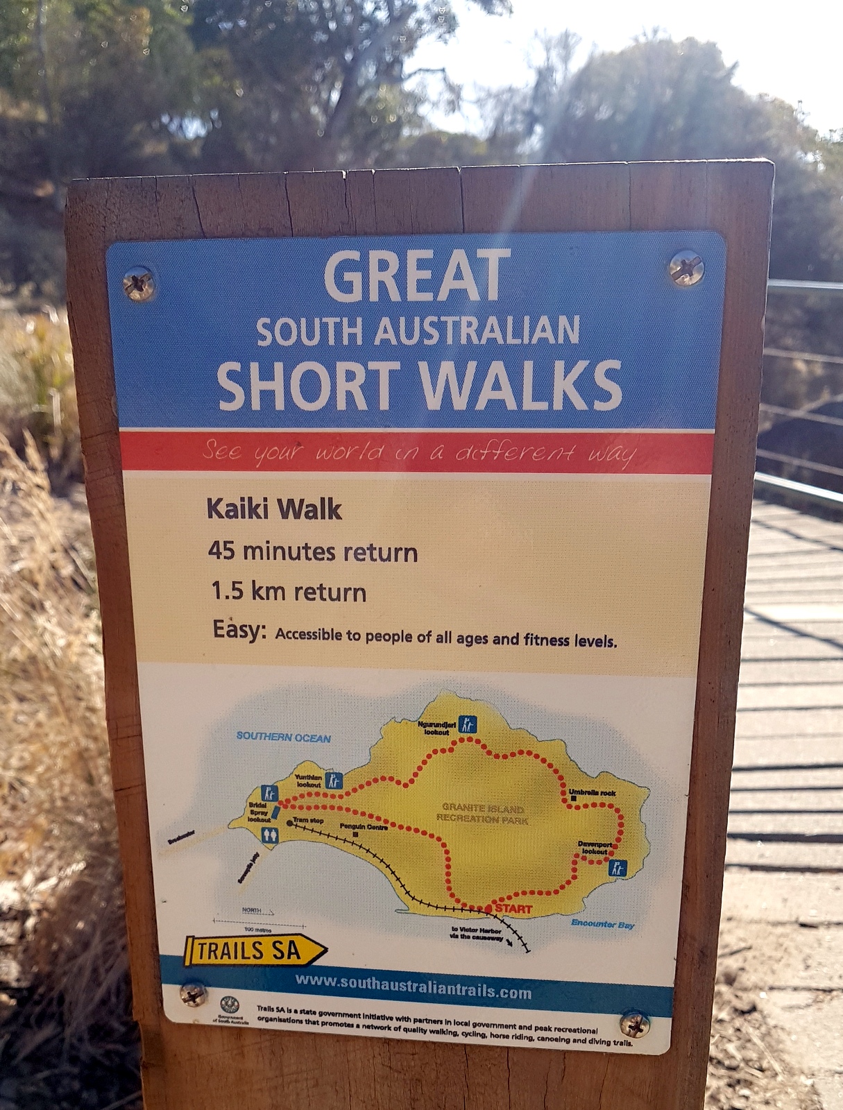 Granite Island est une petite île inhabitée d’environ 25 hectares qui doit son nom à ses nombreux blocs de granit. Dès l’arrivée à pied) sur l’île, on est accueillis par de ces blocs gravé de ses 2 noms: Granite Island et Kaiki (son nom originel aborigène). Kaiki est une sorte de lance dans la langue du peuple Ngarrindjeri dont les croyances racontent que l’île aurait été créée grâce à une lance jetée dans la mer par un guerrier…