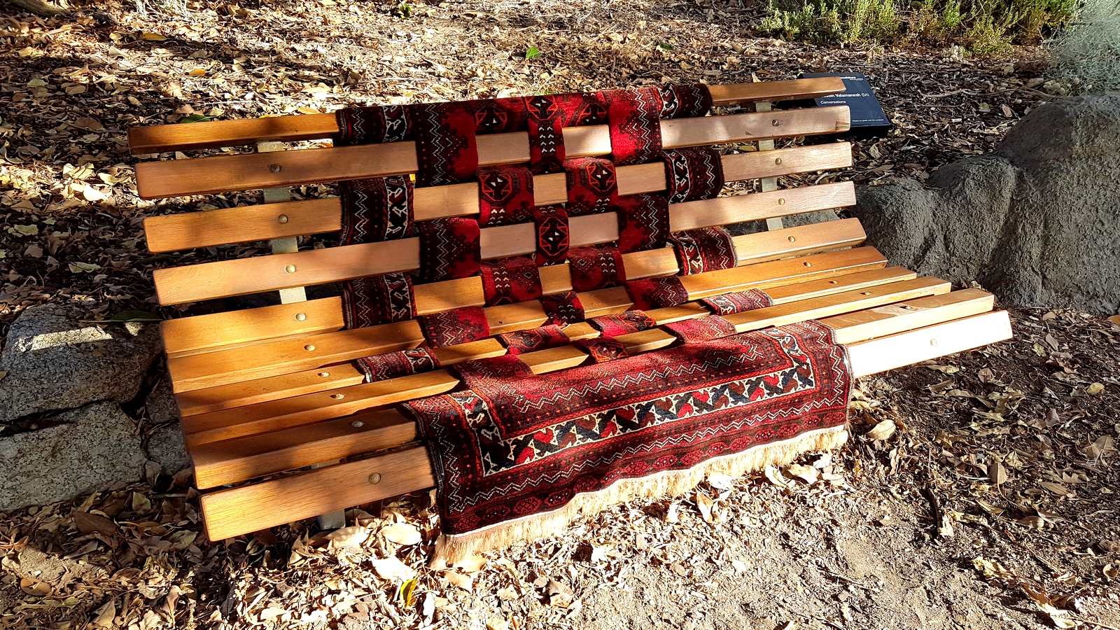 Le tour de l’île se fait par le KAIKI WALK, un sentier d’1,5km ponctué par des sculptures d’art moderne libres d’accès. Il y en avait une douzaine lors de notre visite mais il s’en rajoute régulièrement et il semblerait qu’il y en ait une vingtaine maintenant. J’ai particulièrement aimé les bancs sur lesquels ont été tissés de vrais tapis persans et sur lesquels on pouvait se poser et admirer le paysage…