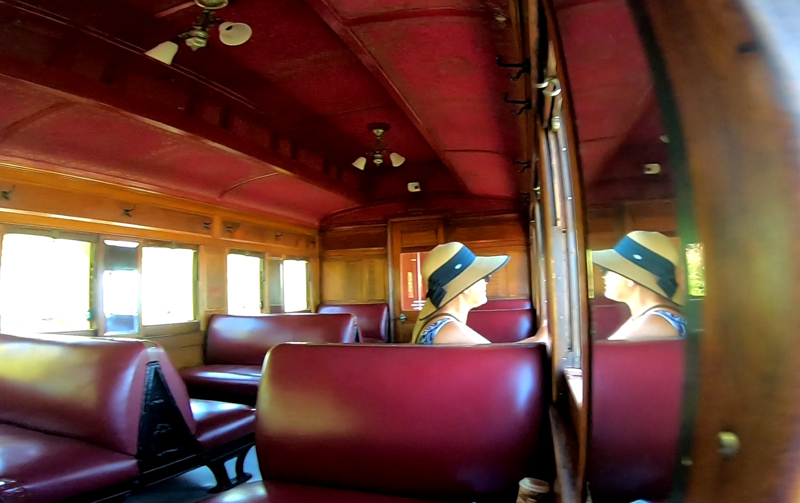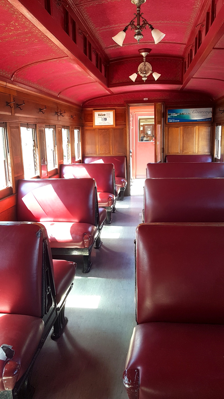 L’intérieur des wagons en bois, cuir et moquette rouge (au plafond) délicieusement rétro, déborde de charme!