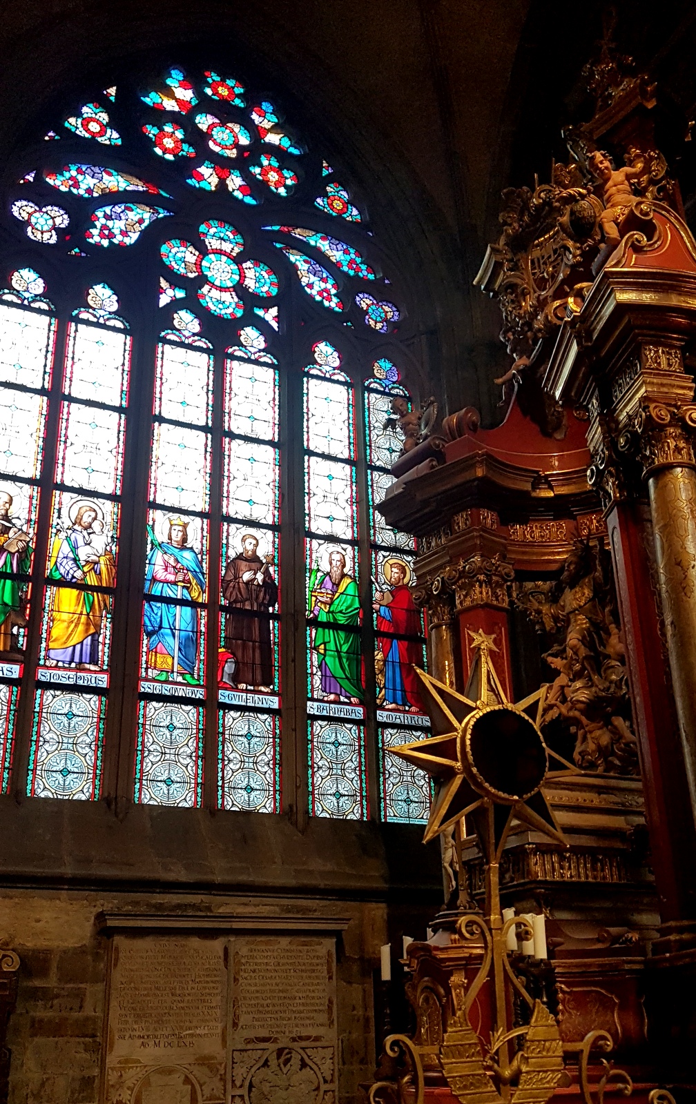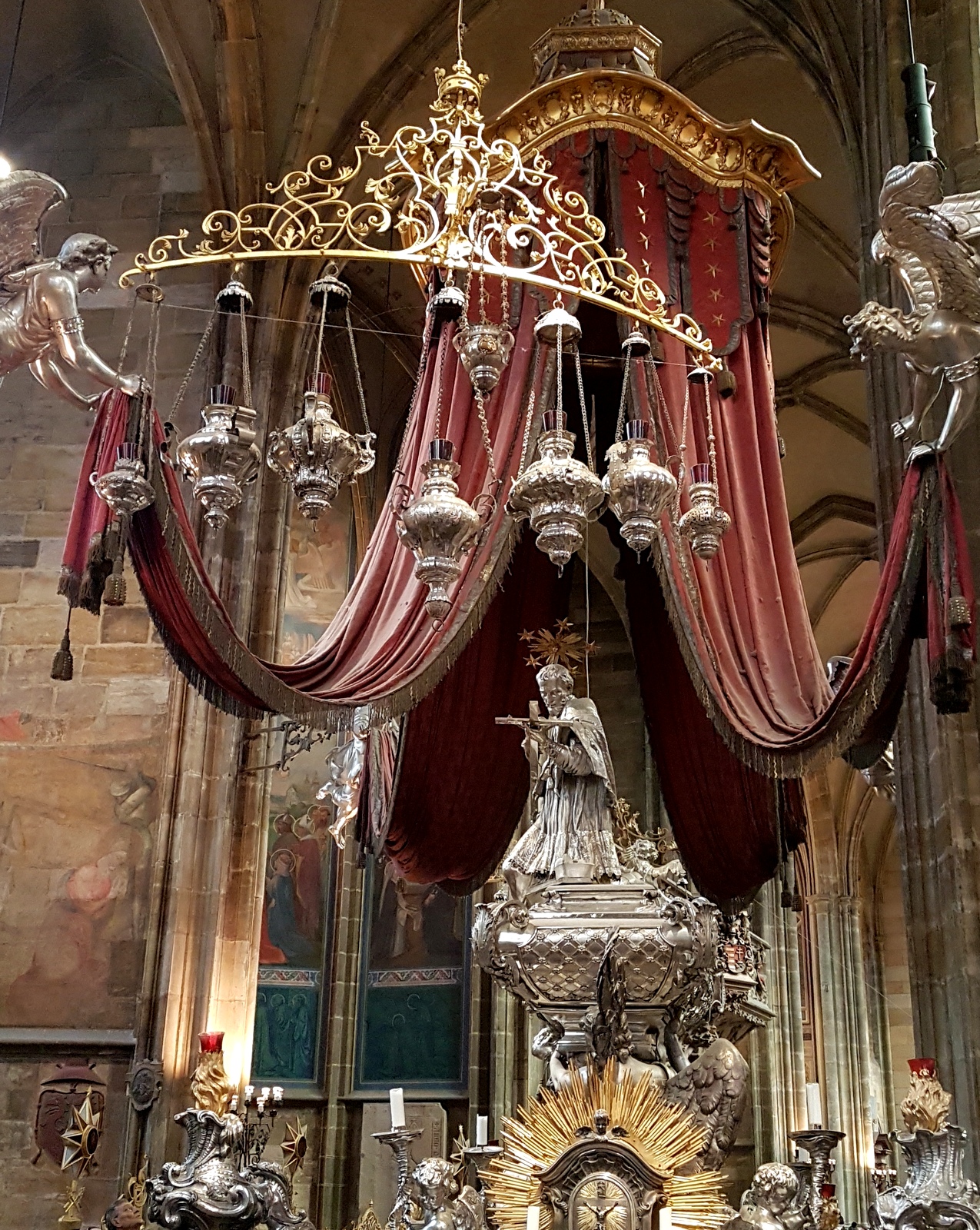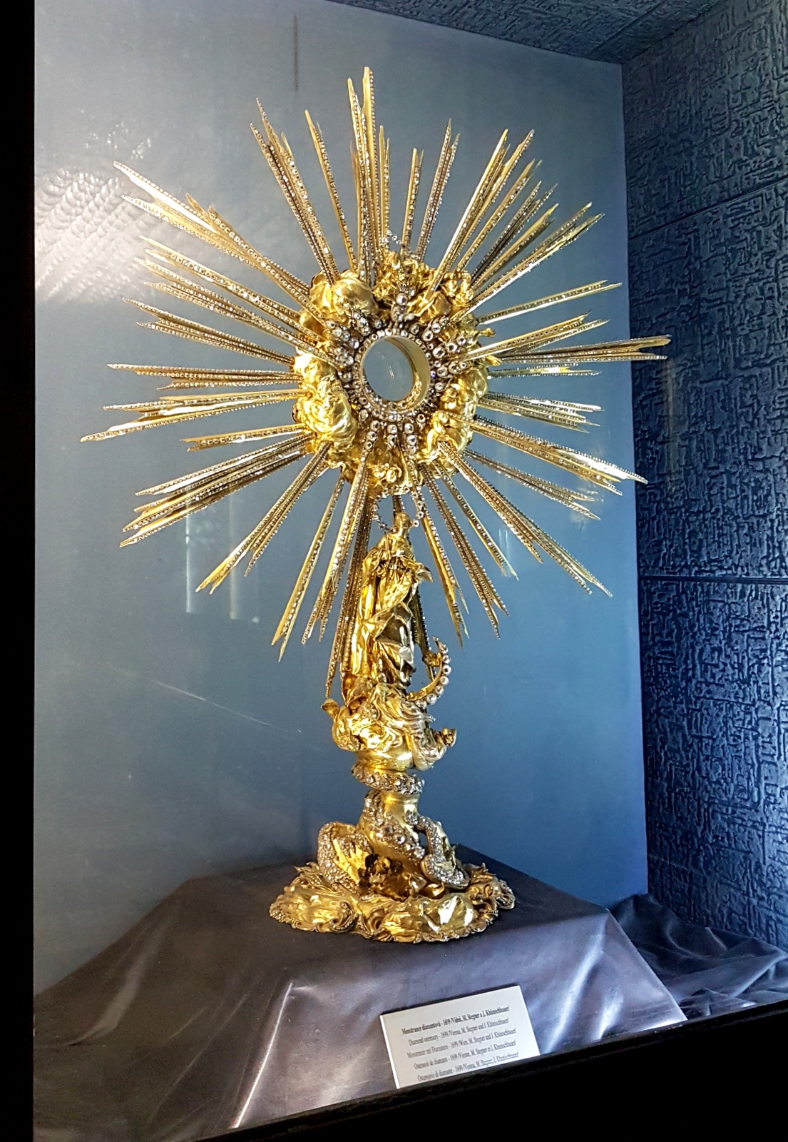 Il s’agit d’un ostensoir de diamants appelé le « Soleil de Prague ». Tout en argent doré, d’un poids total de 12 kg, il est ornementé de 6222 diamants provenant de la robe de mariée de la comtesse de Kolowrat qui les a légués au sanctuaire. Il y en avait 6500 en fait mais les 278 d’écarts ont servi à payer le travail des orfèvres !!!