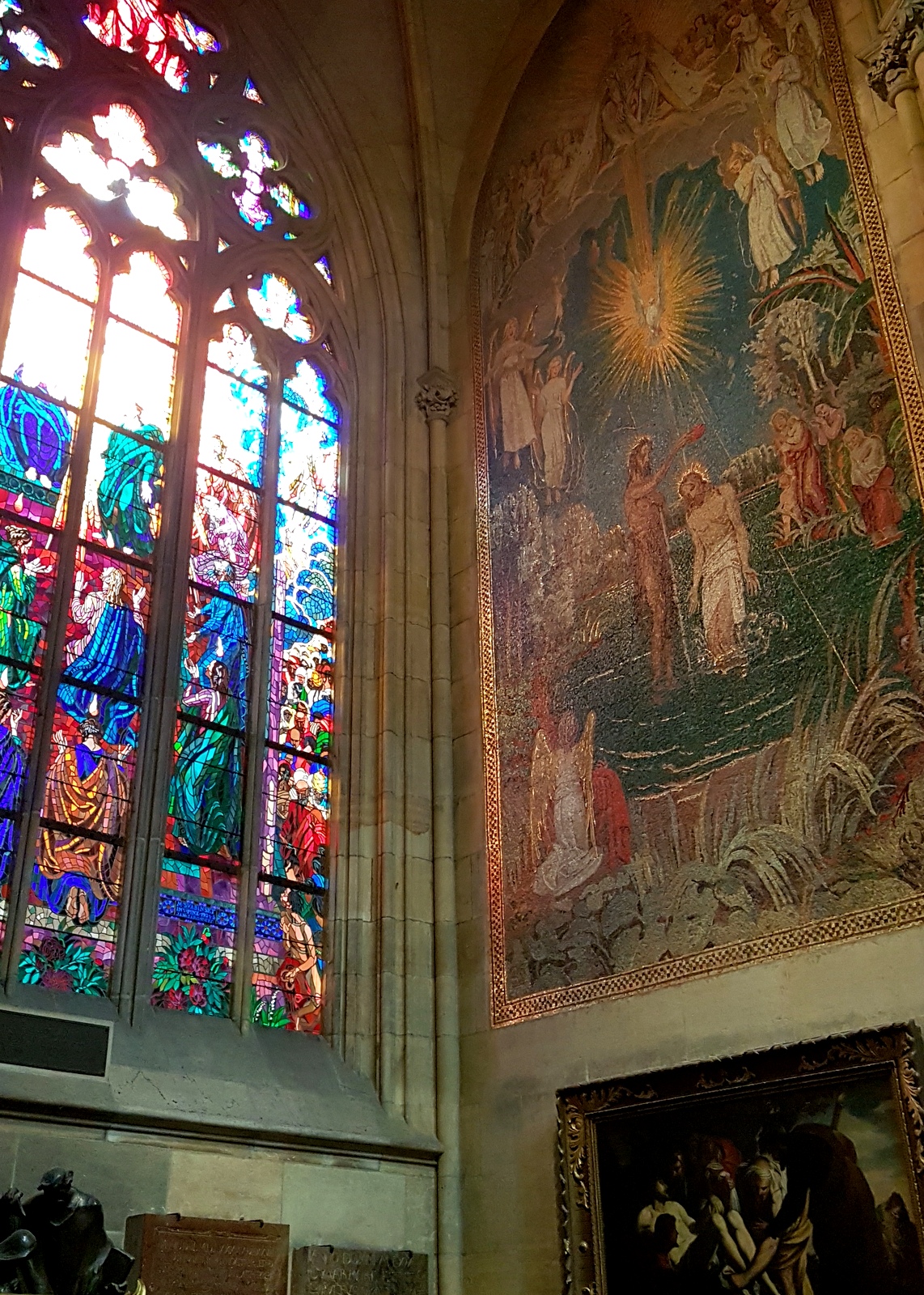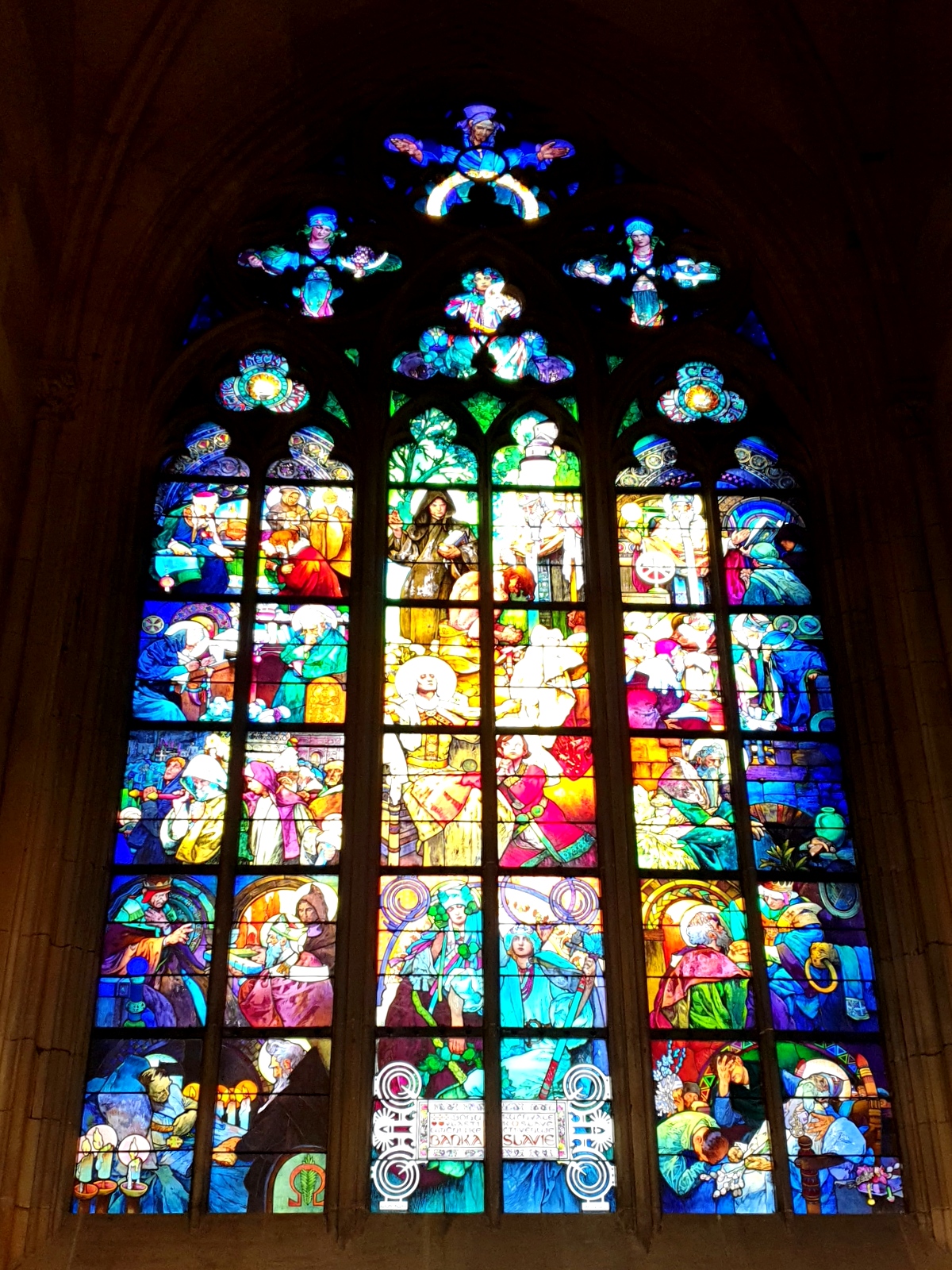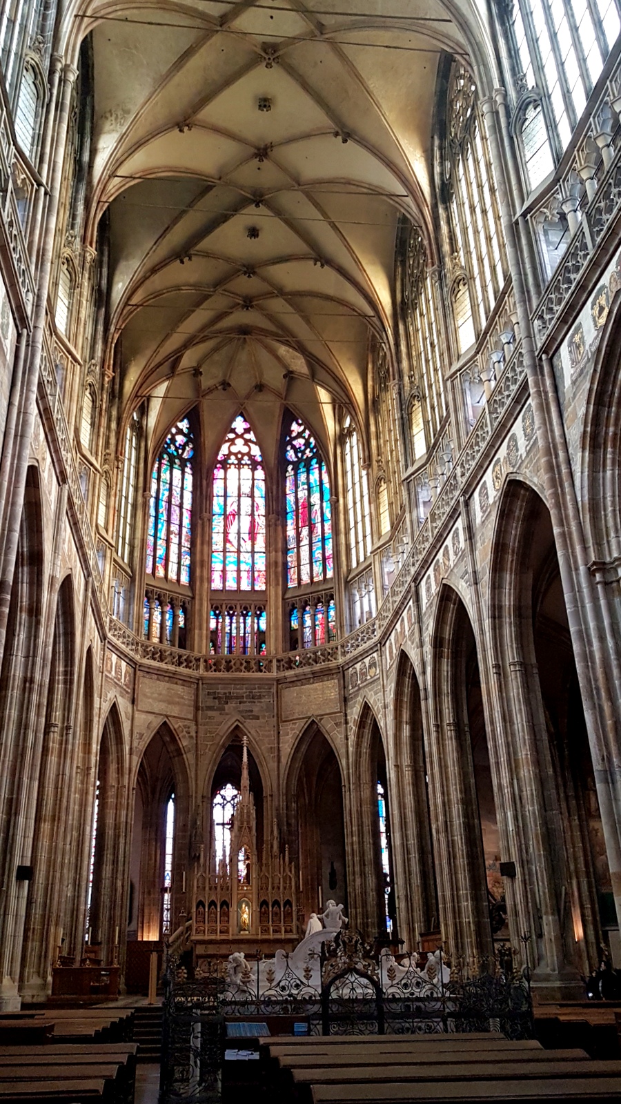 L’intérieur de la cathédrale abrite de nombreux trésors notamment des vitraux somptueux, réalisés par les plus grands artistes de l’époque, dont Alfons Mucha, une des plus grandes figures de l’Art nouveau, qui dessina les vitraux de la partie nord. La crypte des rois de Bohême abrite les sarcophages de plusieurs souverains et la chapelle funéraire Saint-Venceslas, décorée de pierres semi-précieuses et de fresques, accueille le tombeau du saint du même nom. On peut aussi admirer le tombeau en argent massif sous un baldaquin de saint Jean Népomucène, celui qui a été jeté à l’eau depuis le Pont Charles…