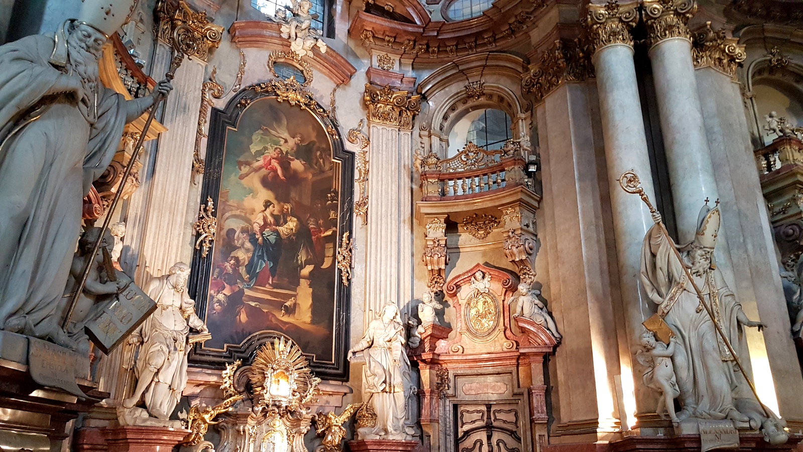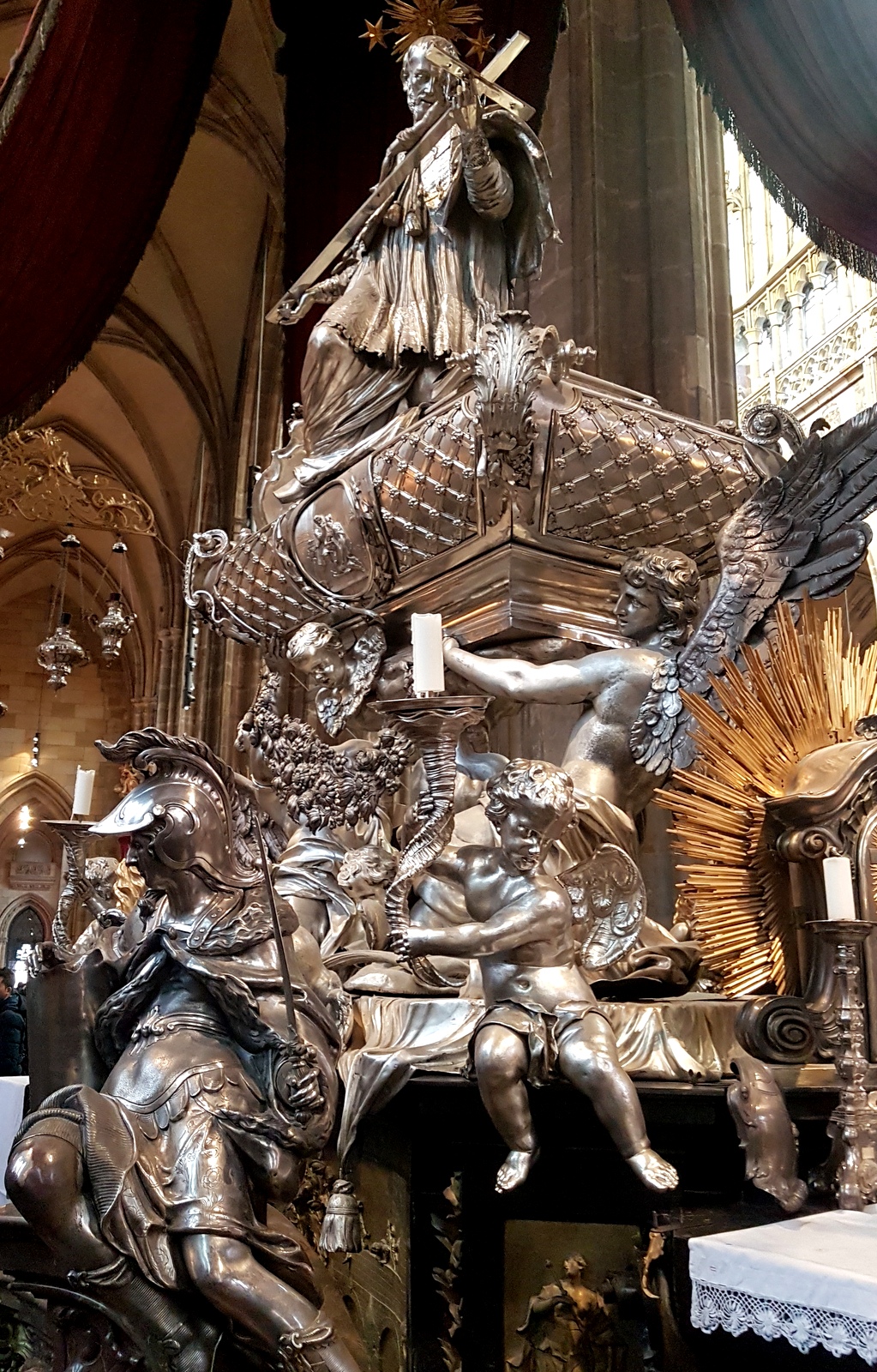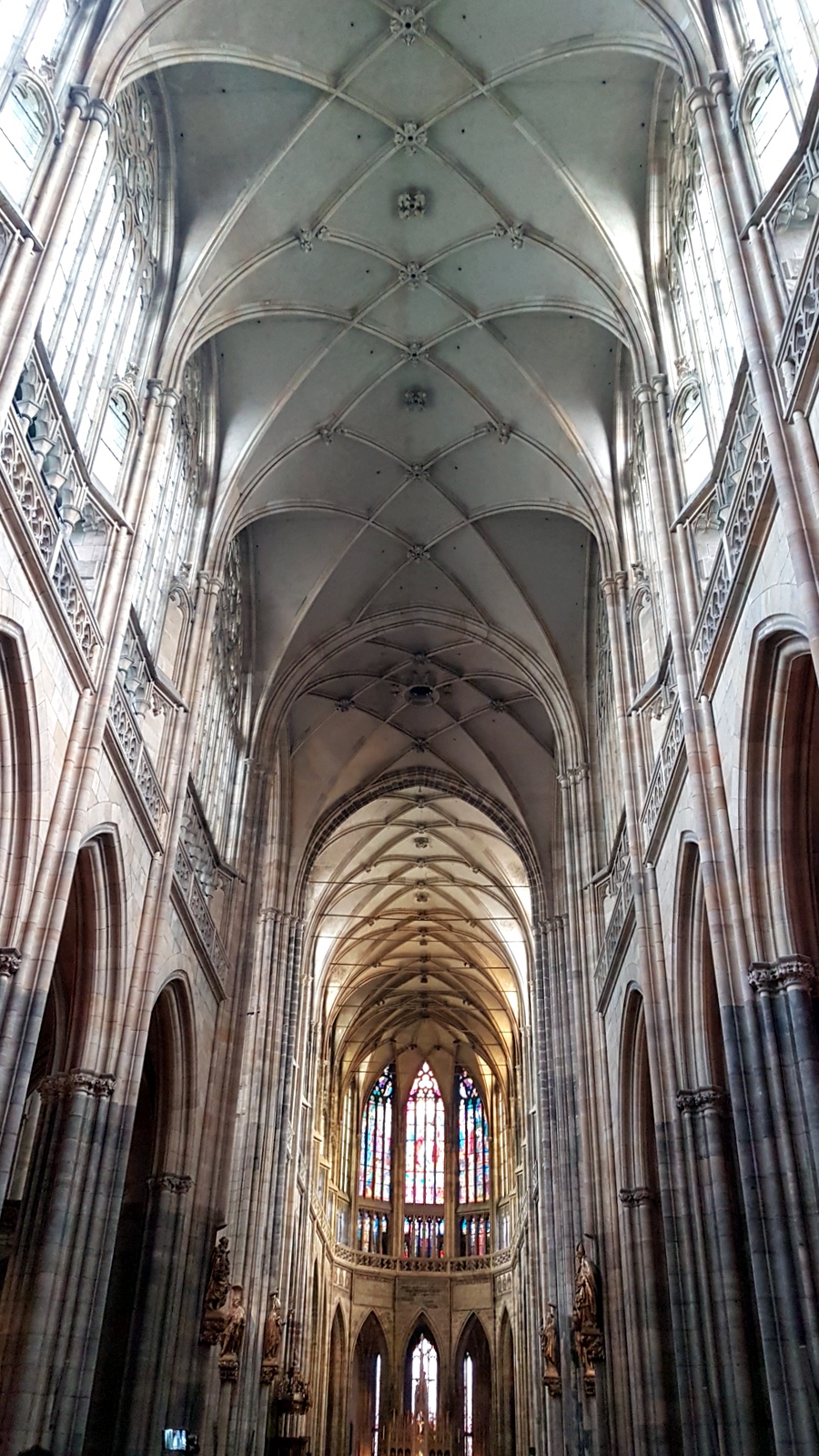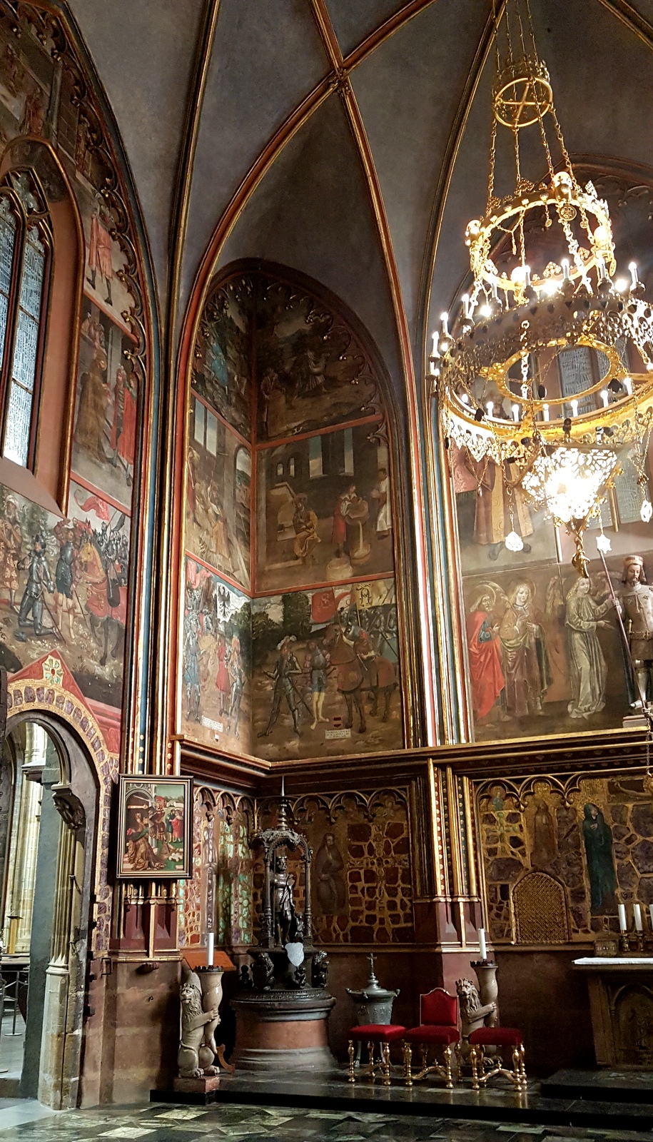 L’intérieur de la cathédrale abrite de nombreux trésors notamment des vitraux somptueux, réalisés par les plus grands artistes de l’époque, dont Alfons Mucha, une des plus grandes figures de l’Art nouveau, qui dessina les vitraux de la partie nord. La crypte des rois de Bohême abrite les sarcophages de plusieurs souverains et la chapelle funéraire Saint-Venceslas, décorée de pierres semi-précieuses et de fresques, accueille le tombeau du saint du même nom. On peut aussi admirer le tombeau en argent massif sous un baldaquin de saint Jean Népomucène, celui qui a été jeté à l’eau depuis le Pont Charles…