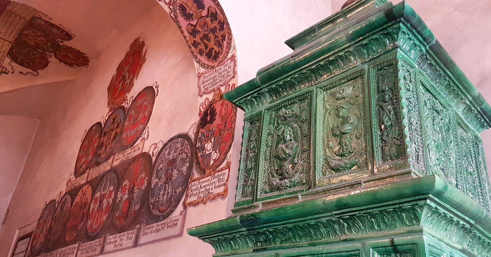 C’est dans ce palais que j’ai découvert ce système ancien de chauffage typique, des énormes poêles en faïence de couleur qui sont aussi efficaces qu’ils sont beaux. Il semble qu’ils soient une variante du Kachelofe alsacien qui aurait été inventé au milieu du 16 ème siècle. On peut en voir 3 modèles différents dans le palais…