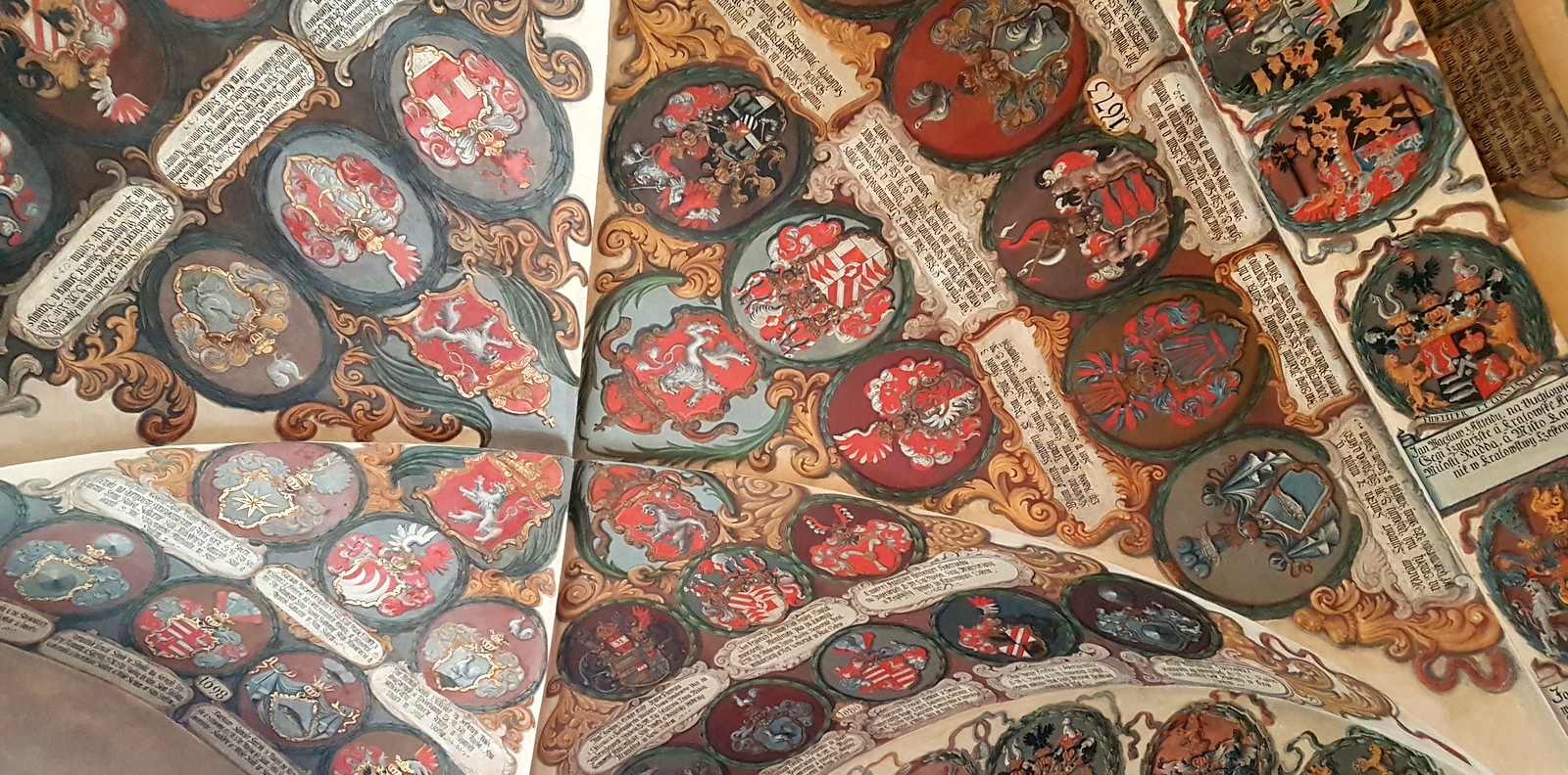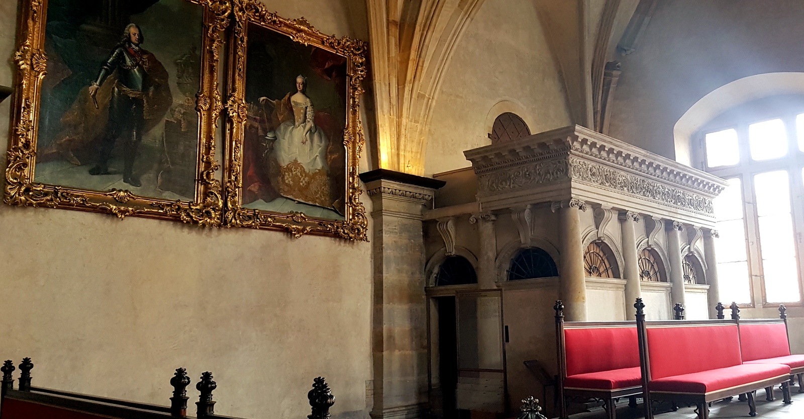 Par le petit escalier sur la gauche (pas très bien indiqué), on accède à la Salle des Registres où étaient consignées les délibérations de la Diète et à la petite pièce de la Chancellerie d’où a eu lieu la seconde défenestration de Prague en 1618 qui est considérée comme l’événement déclencheur d’une vaste guerre de religion qui allait déchirer l’Europe entière, connue sous le nom de Guerre de trente ans. Les murs et la voûte du hall d’entrée sont magnifiquement décorés de nombreux blasons peints sur les murs et les plafonds.