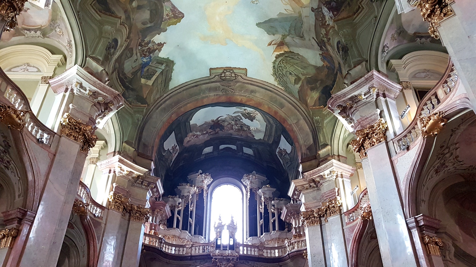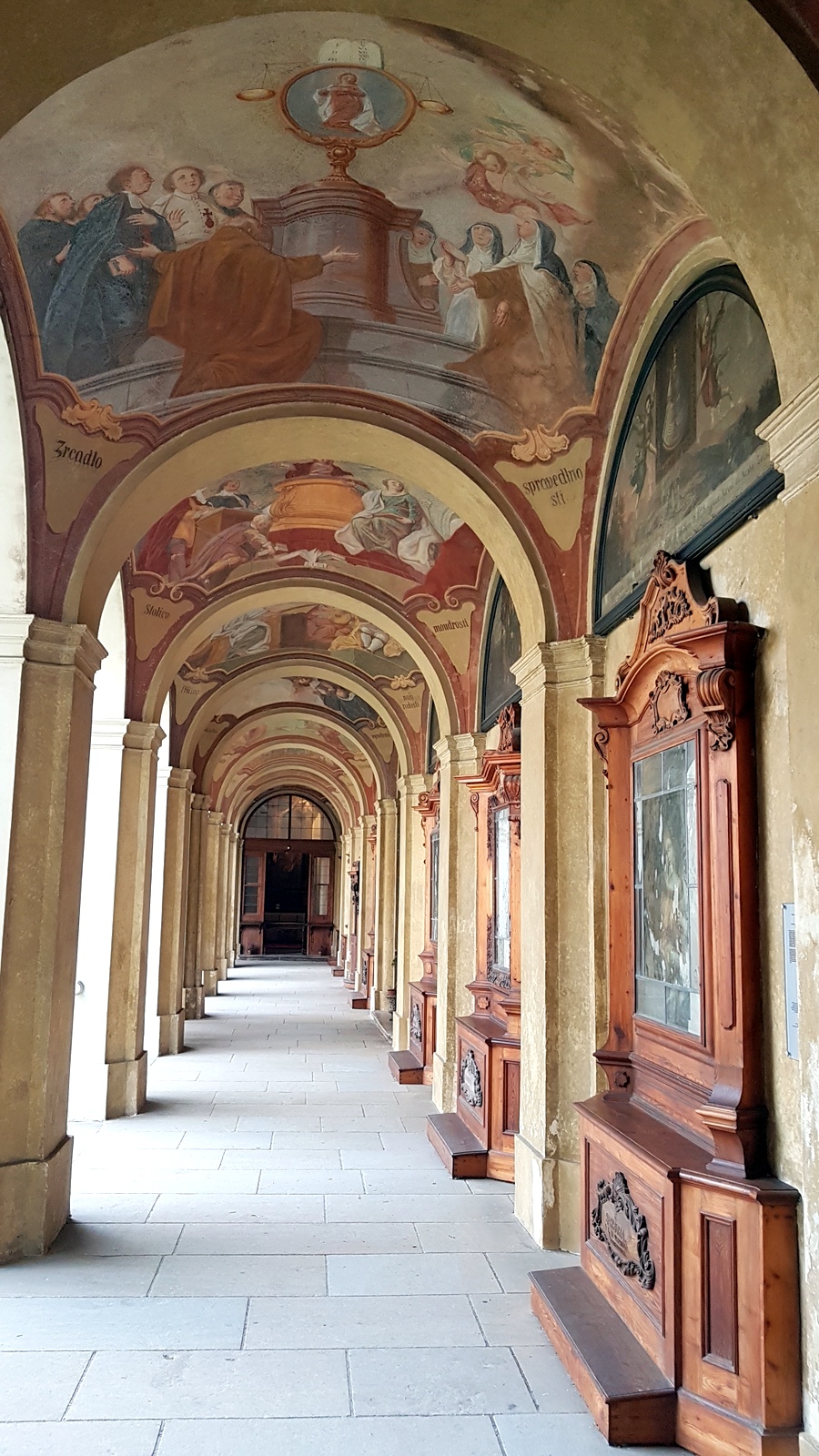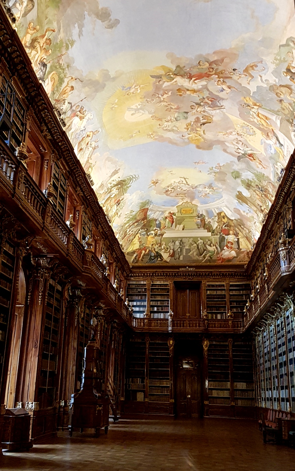 La salle philosophique ((1794) sur 2 étages, a un plafond orné d’une belle fresque qui retrace « l’évolution spirituelle de l’être humain ». La salle de théologie, la plus ancienne (1670’s) et la plus belle, est celle qui ressemble le plus à celle du Clementinum. Elle est également, ornée de fresques au plafond et abrite des globes terrestres et célestes réalisés au 17ème siècle!!! On peut en faire une visite en 3D sur le site officiel.