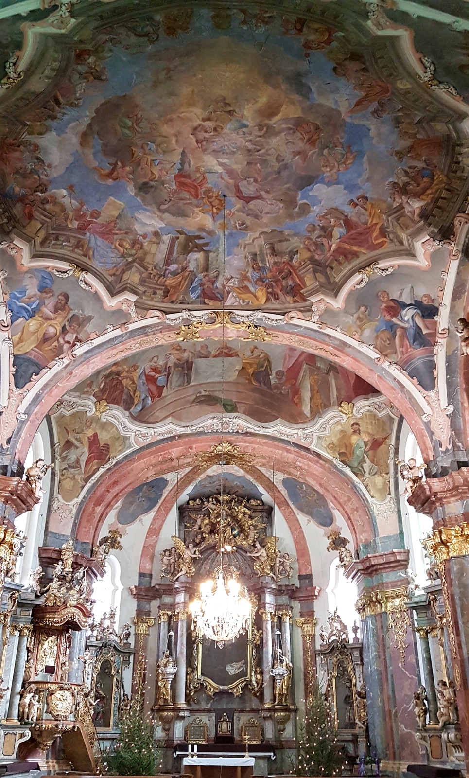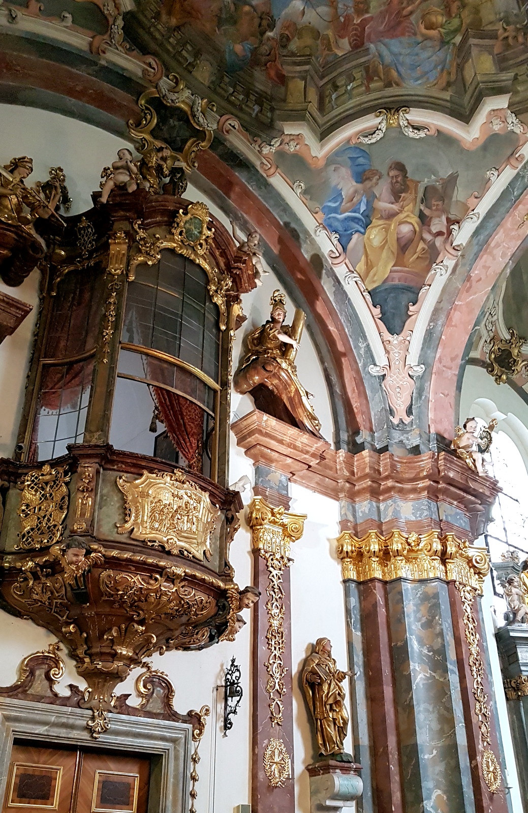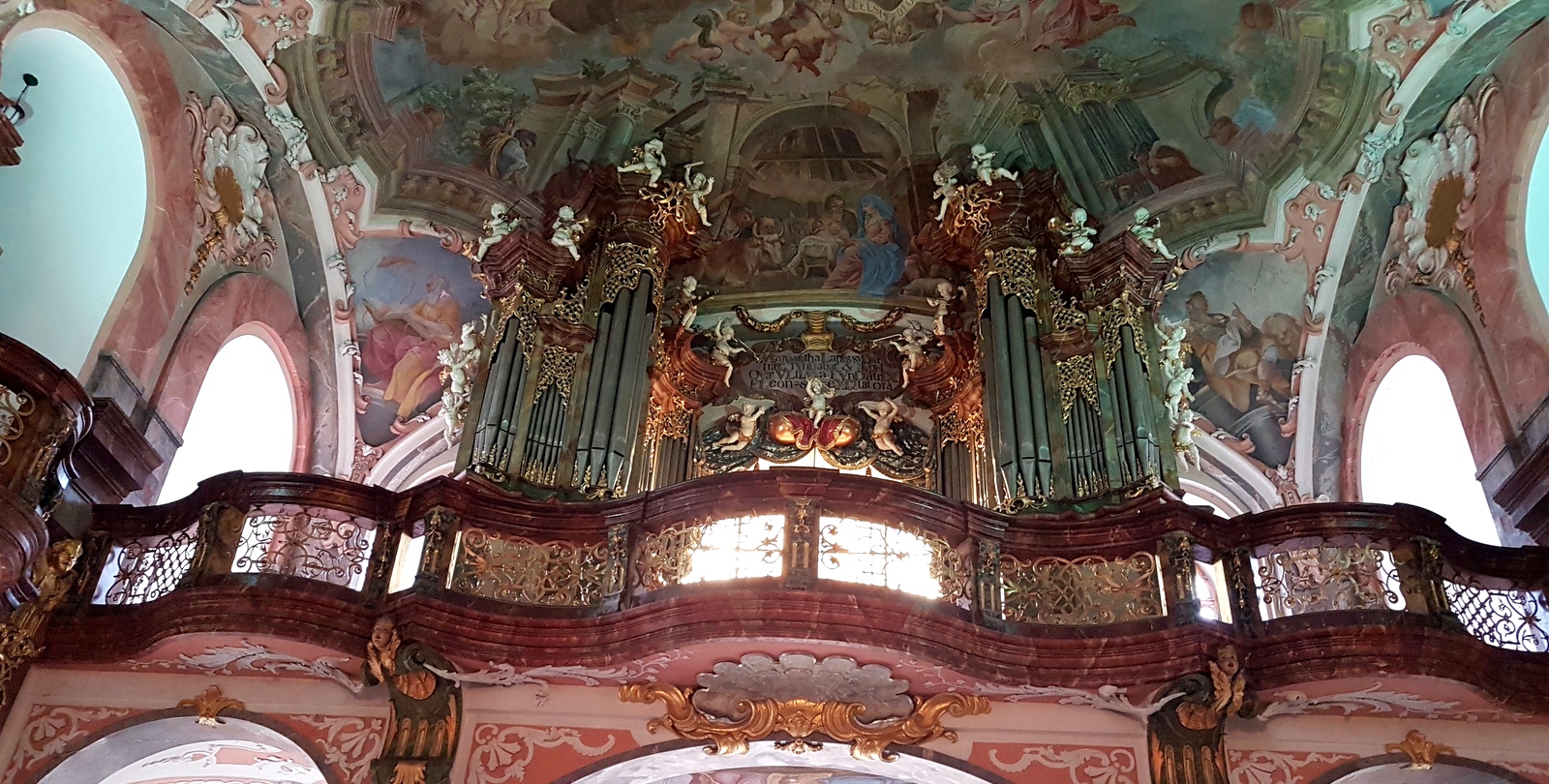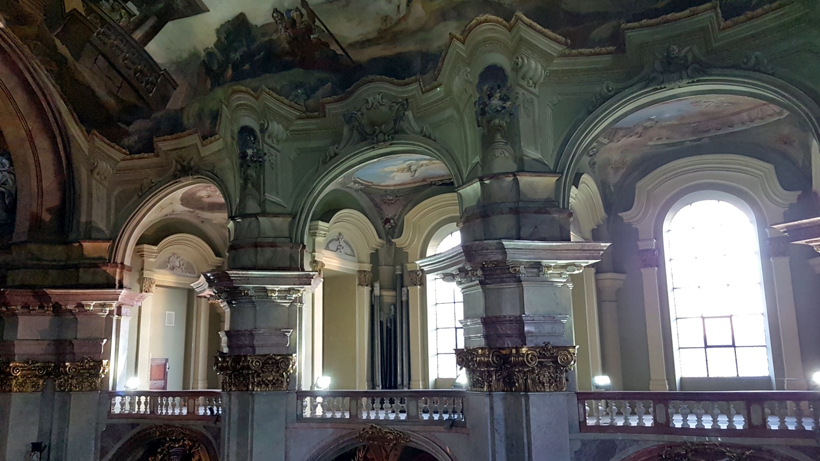 N’hésitez pas à montez au 1er étage par les escaliers pour avoir une vue magnifique sur l’ensemble de l’église, ses splendides fresques au plafond, son impressionnante orgue…