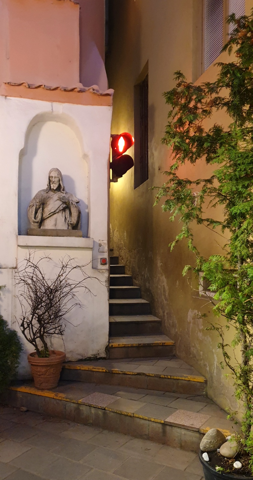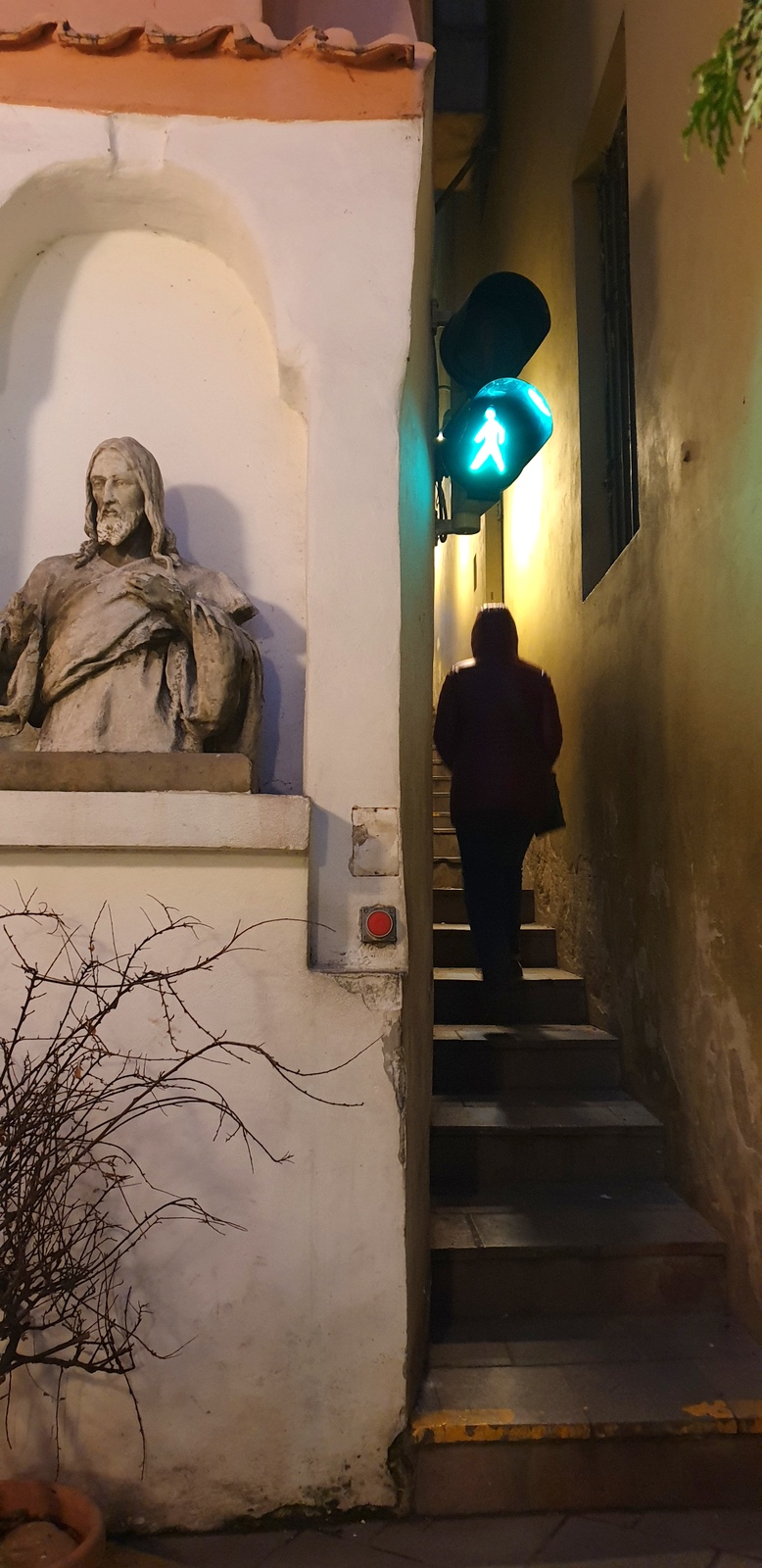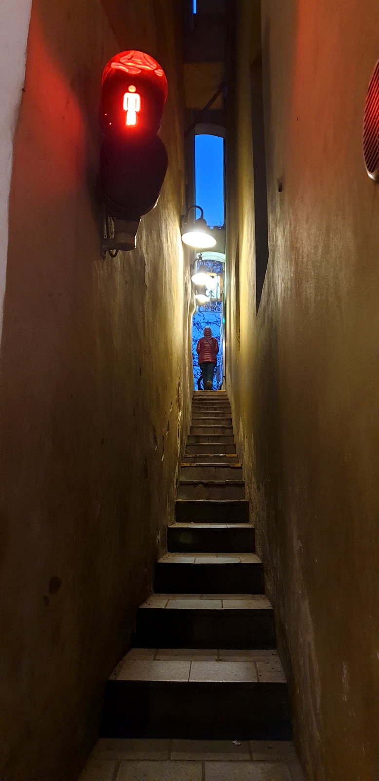 Il faut revenir un peu sur nos pas pour découvrir la plus petite ruelle de la ville avec 50 cm seulement de largeur si bien qu’on ne peut pas s’y croiser. En fait, c’était au départ un coupe-feu entre les bâtiments… L’idée astucieuse et hautement appréciée par les touristes, pour éviter les « embouteillages », a été d’y installer un feu pour piétons: rouge, je patiente et vert, j’y vais…