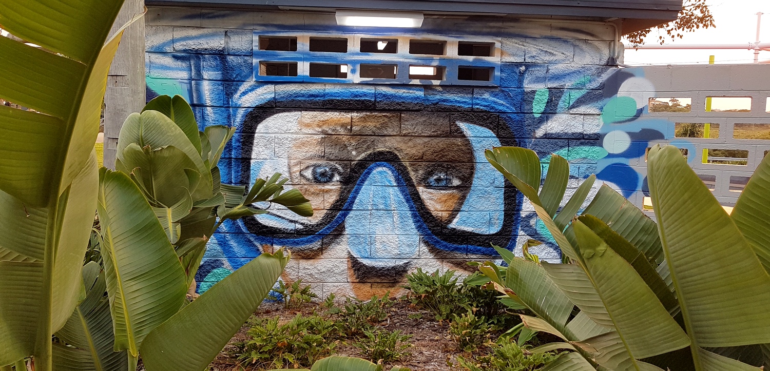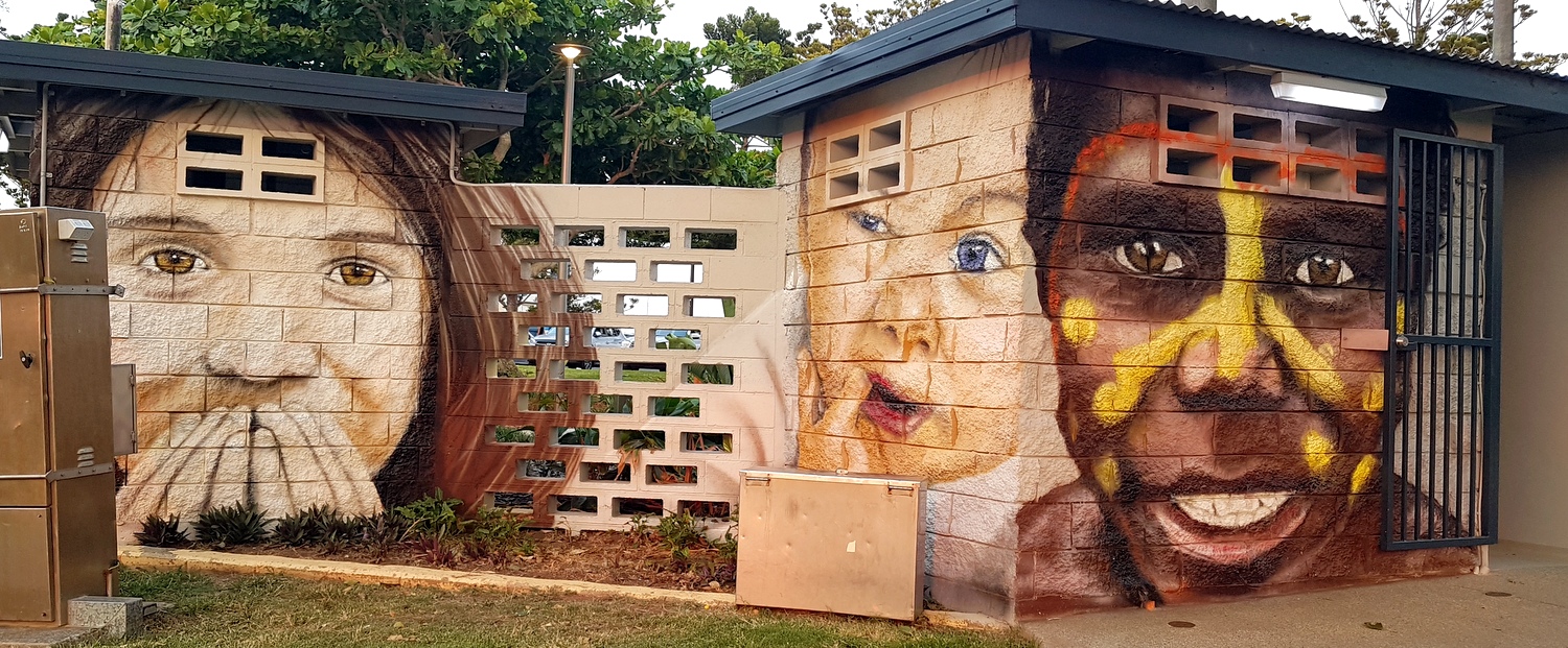 – sur les murs des toilettes du skate Park dans le Appleton Park près du lagon où on peut voir d’un coté des visages d’enfants de toutes races et de l’autre des plongeurs…