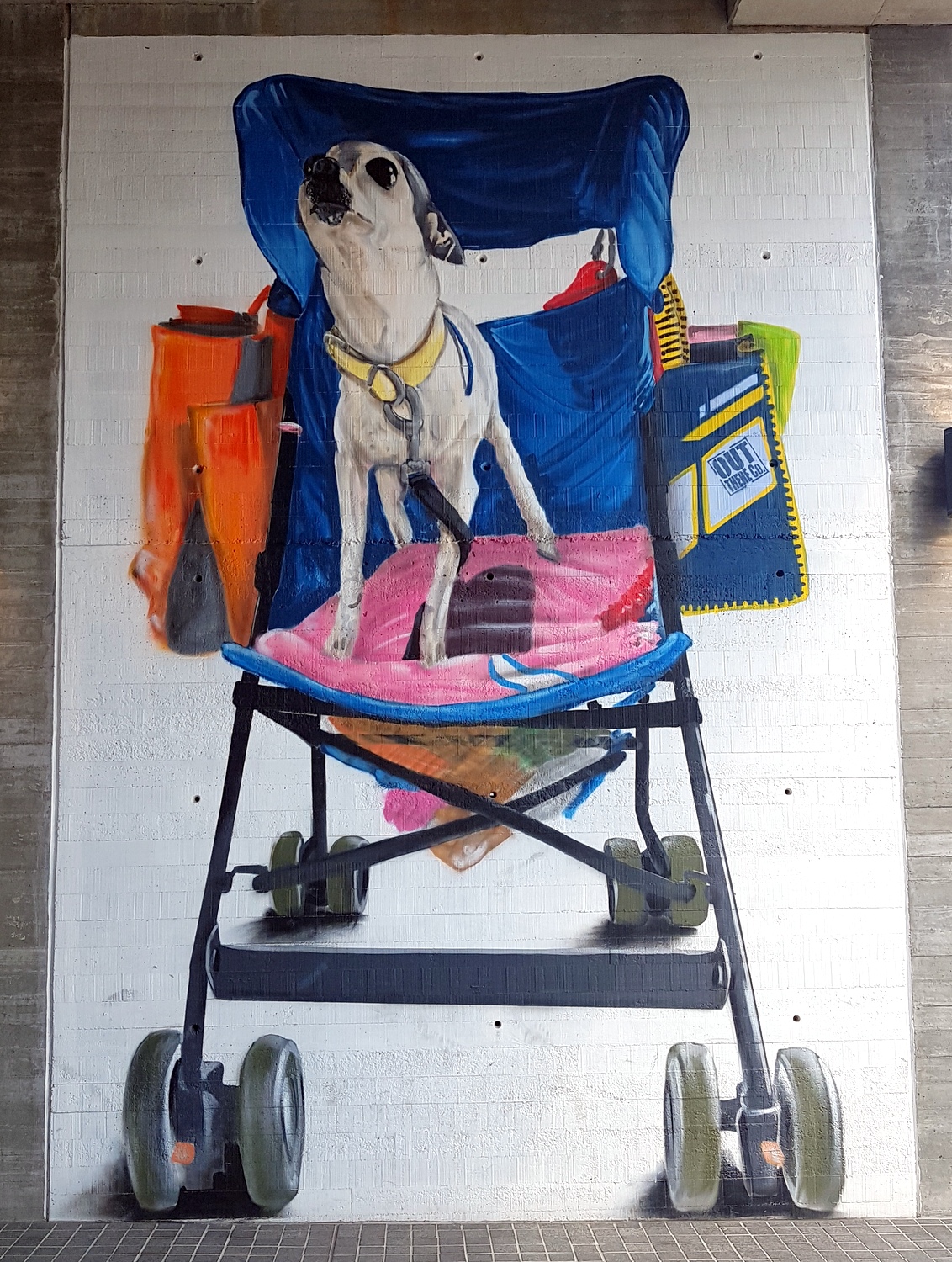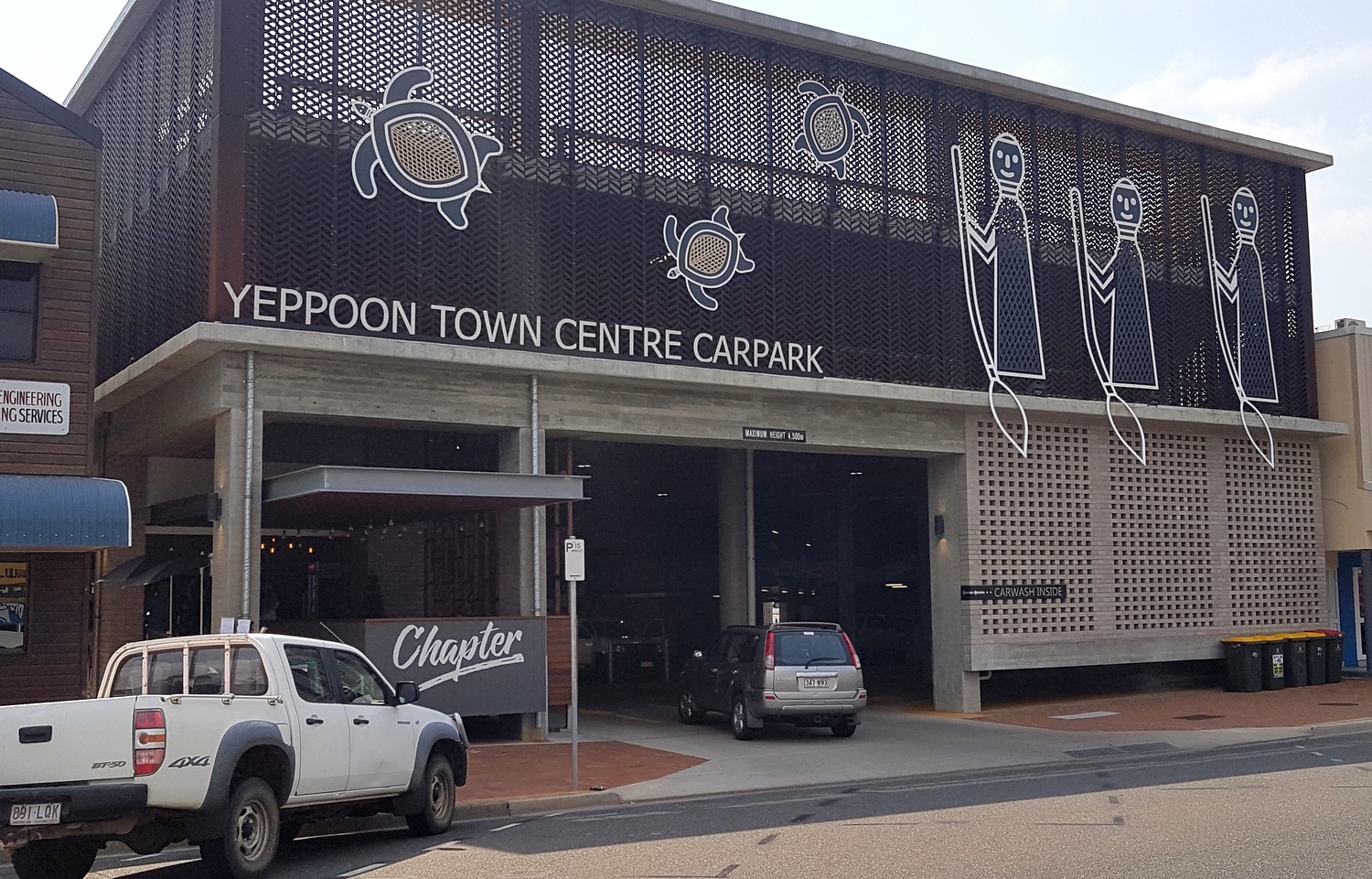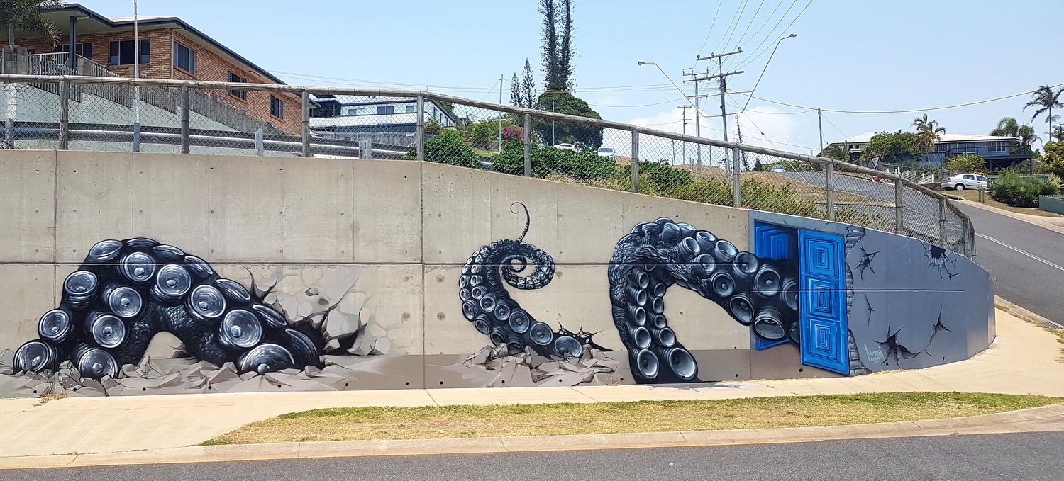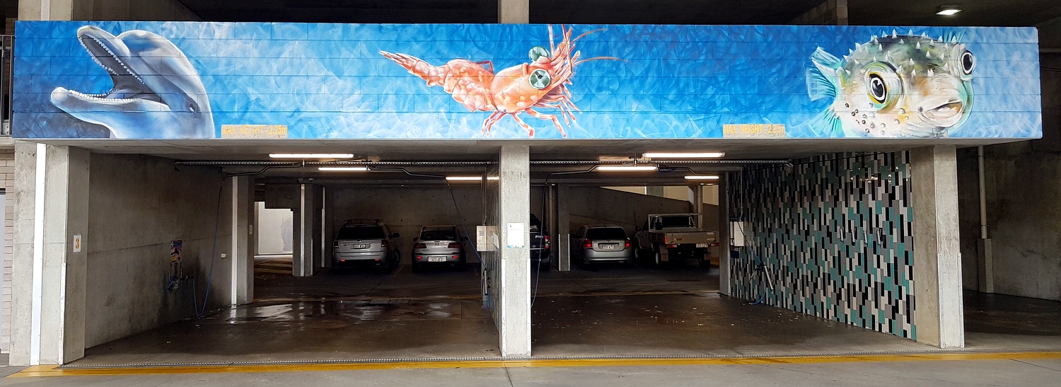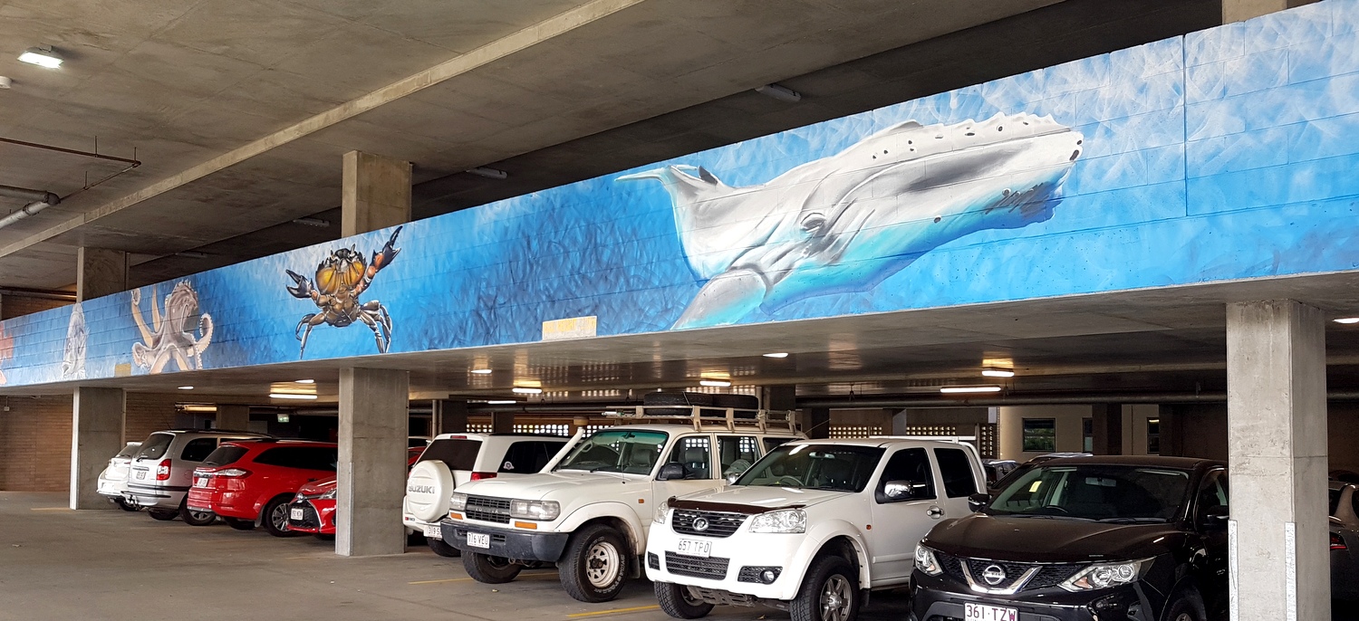 – dans le parking public de la ville au 42 Park St: un gigantesque Lionfish (rascasse), un chien (Pram Dog), les portraits d’un duo de musique locale (Busby Marou) et de nombreux autres animaux marins (dauphin, baleine, pieuvre,…) et une immense peinture aborigène représentant des chasseurs de tortues sur la façade du parking.