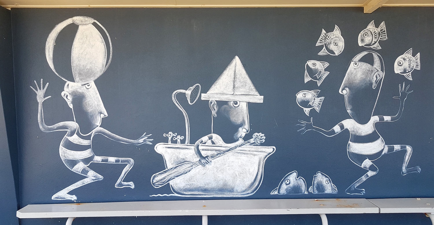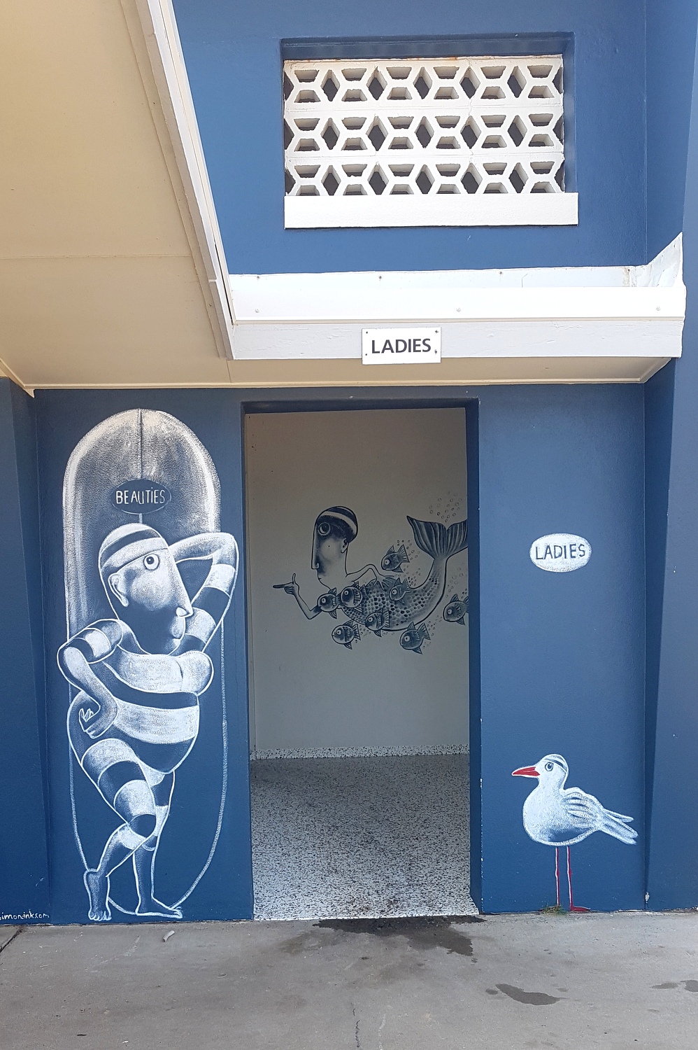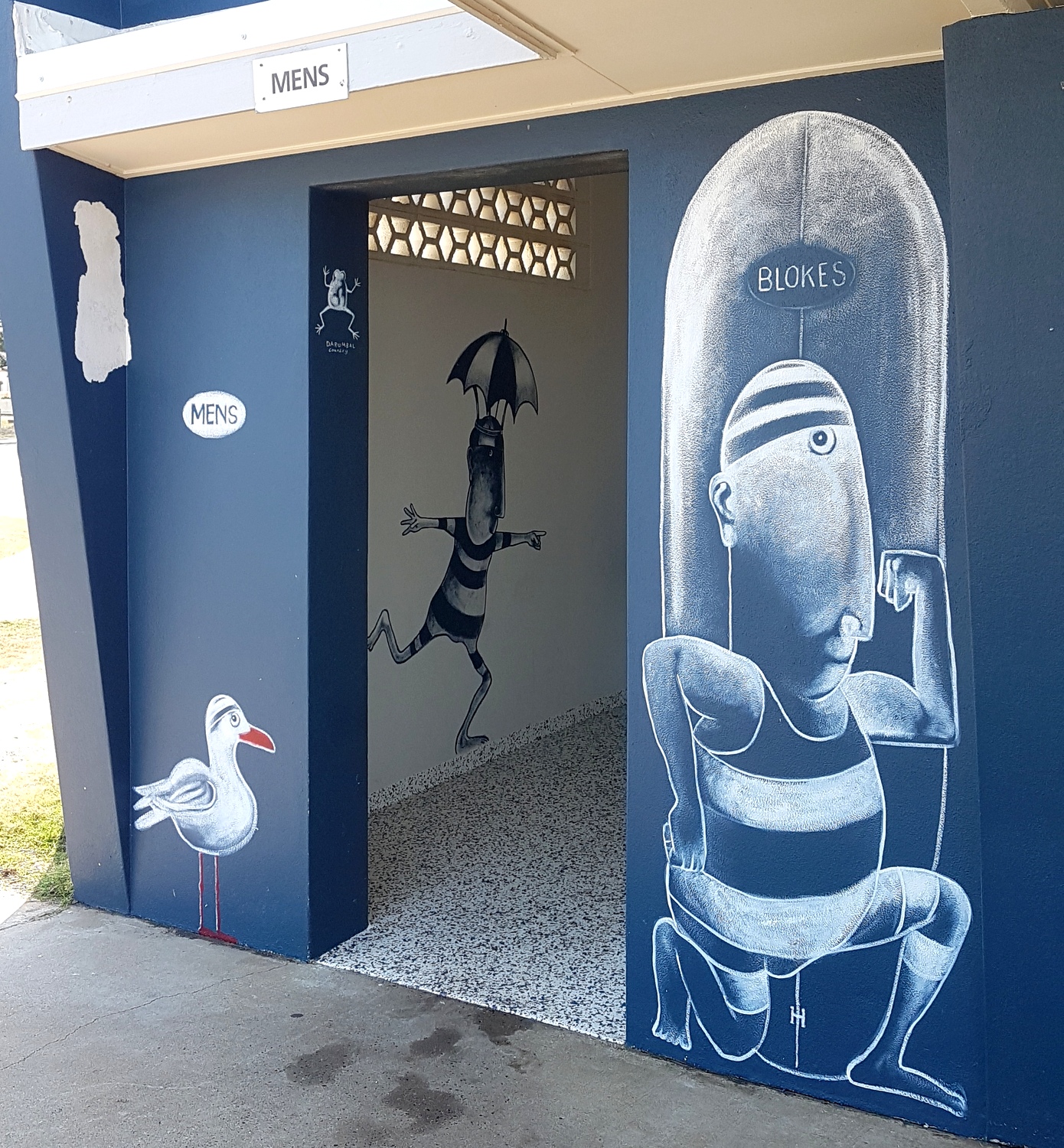 – sur les murs du pavillon de la principale plage d’Emu park où toujours le même Simon McLean a représenté des scènes concernant cette-ci fois des baigneurs…